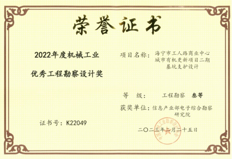 【提要描述】近日,中国机械工业勘察设计协会宣布“2022年度机械工业优秀工程勘察设计奖”获奖名单,电勘院共获得工程勘察类奖项2项。“西安万科城7#地商业项目基坑支护设计及监测”获得二等奖,“海宁市工人路商业中心都会有机更新项目二期基坑支护设计”获得三等奖。