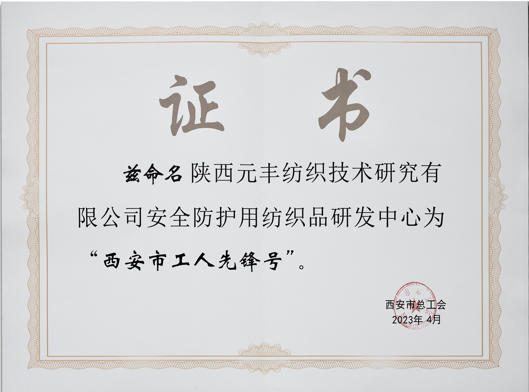 【提要描述】近期,西安市总工会印发《关于命名2023年西安市五一劳动奖状、西安市五一劳动奖章和西安市工人先锋号的通报》,陕西元丰纺织技术研究有限公司宁静防护用纺织品研发中心荣获“西安市工人先锋号”荣誉称呼。